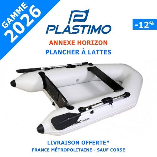 L'ANNEXE PLASTIMO HORIZON PLANCHER GONFLABLE est une version plus élaborée de la gamme Horizon. Le plancher rigide apporte un plus indiscutable en termes de stabilité et de confort. C'est une annexe très fiable qui existe en 4 versions de 2m00 à 2m60. Motorisation jusqu'à 6 cv. Garantie 2 ans. Livrée prête à l'utilisation avec siège, pagaies, gonfleur et sac de transport.